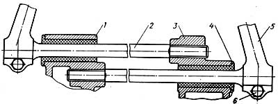 1 и 3 — нижние кронштейны; 2 — торсион; 4 — резиновая втулка; 5 — рычаг торсиона; 6 — стяжной болт.